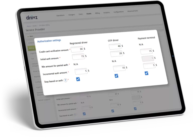 Driivz’s flexible and robust billing solution offers the most comprehensive set of parameters network operators can use to formulate creative plans and tariffs that will attract the widest variety of subscribers and scale their business. These include rating by kWh or time, static and dynamic cost factoring, time-of-use tariffs, flat/minimum/transaction fees, maximum charging allowance by time, energy or cost, parking fees, a variety of options for overtime penalties, reservations, coupons, membership plans for fleets, free charging promotions for Automotive OEMs and more.